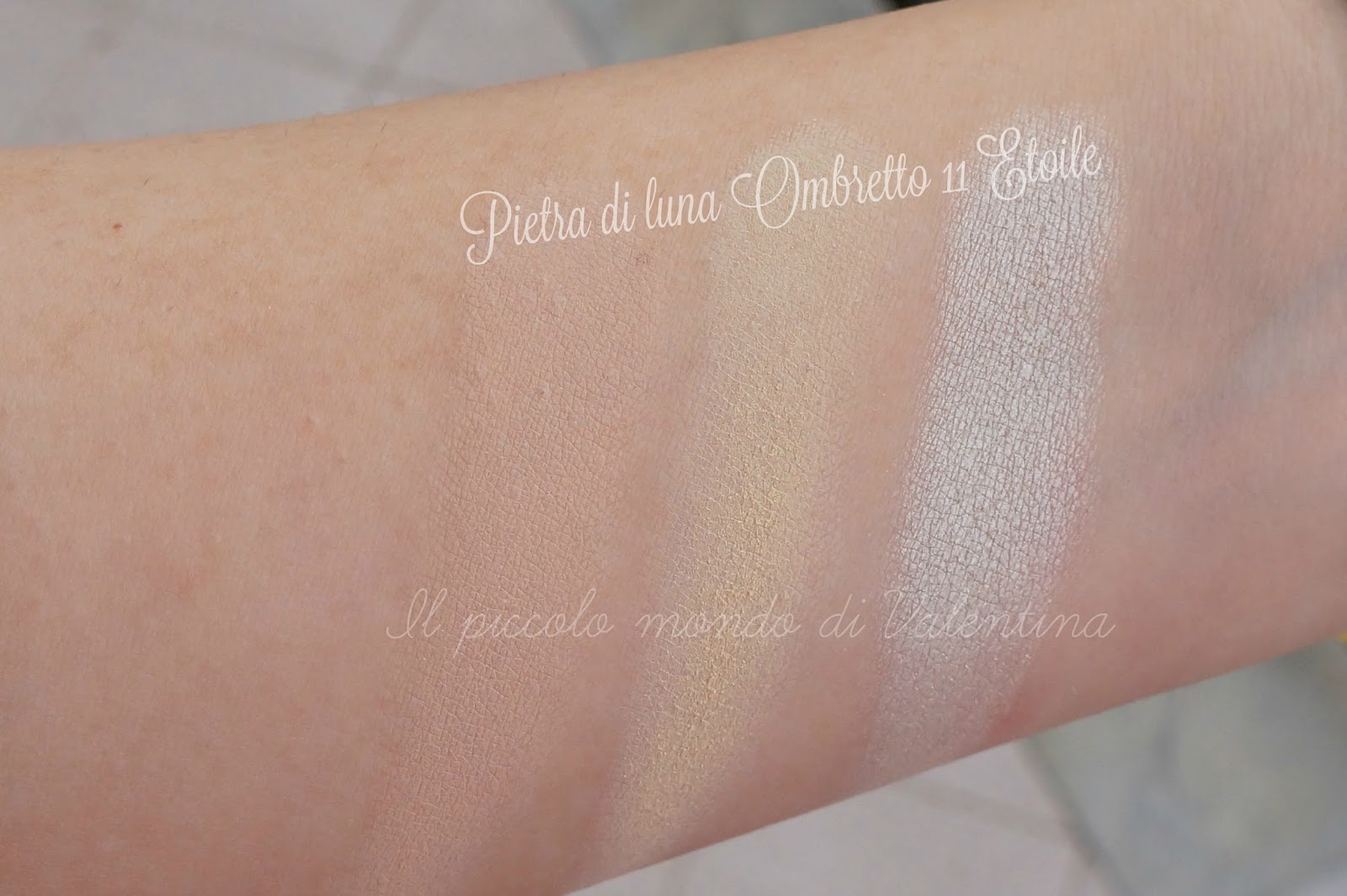 Ho paragonato il n. 11 con due ombretti molto chiari che uso alla stessa maniera. Notiamo però come siano molto differenti tra loro : Etoilè è un bianco avorio shimmer, Pietra di Luna è davvero un bellissimo colore che vira sul rosato.