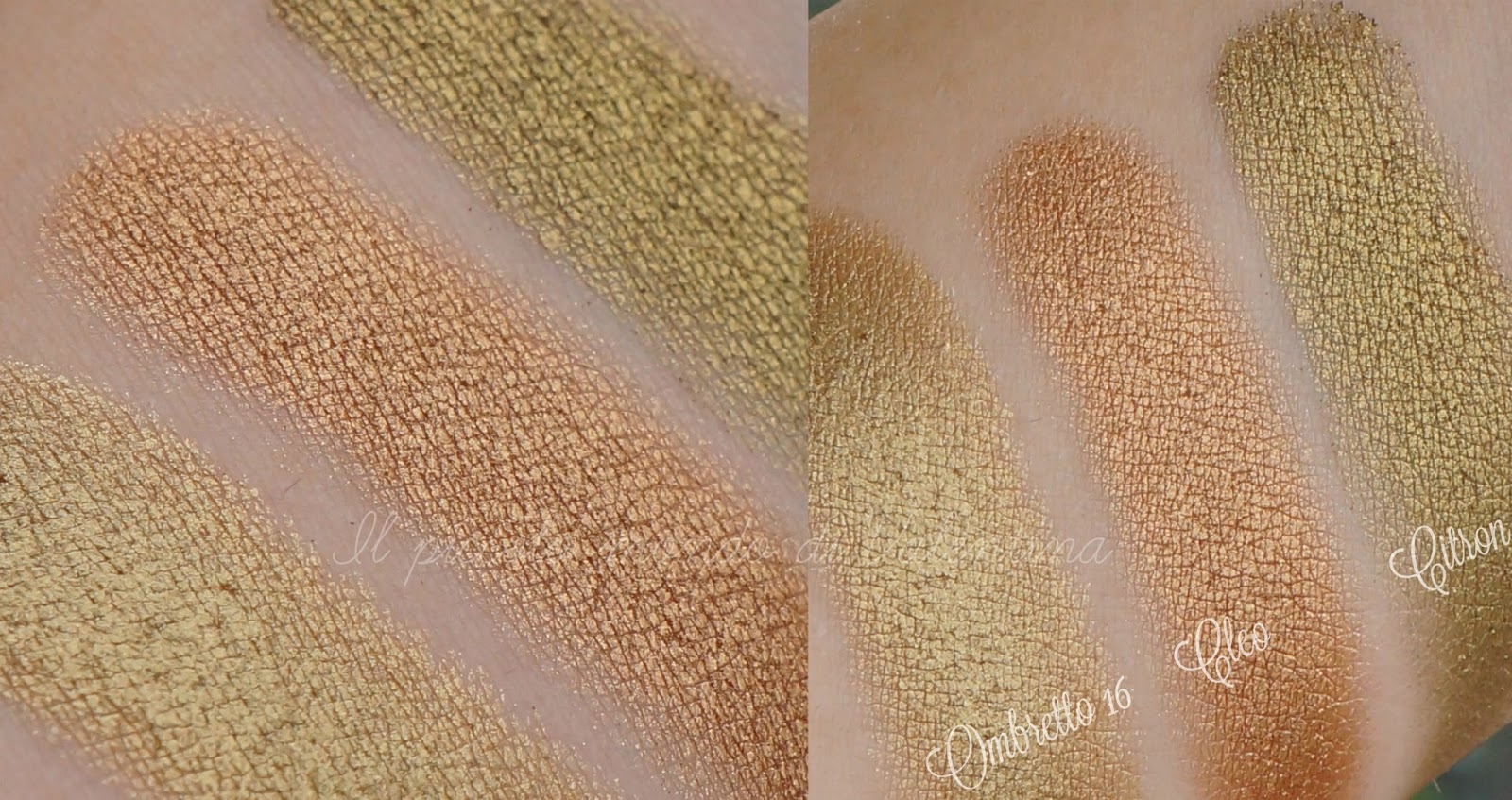 Ho paragonato l’Ottone con Cleo e Citron di Nabla Cosmetics. Notiamo come Cleo sia una tonalità oro con base bronzata mentre Citron è un color oro più scuro e spento virante al verde lime ed a mio avviso anche meno portabile o comunque più pesante sul viso.