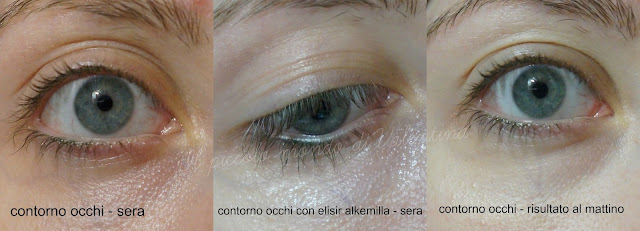 ( In foto la luce non è sempre uguale ma potete notare da sinistra lo stato del mio contorno occhi la sera dopo essermi struccata, nella seconda foto applico l’elisir che si assorbe rapidamente e nella terza foto lo stato del mio contorno occhi l’indomani. Io personalmente tranne un effetto idratante non ho notato appunto nessun miglioramento dal punto di vista occhiaie e per fortuna non possiedo borse )
