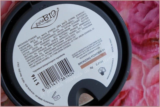 I bronzer di Purobio sono arricchiti con estratti vegetali di : Amido di Mais (La sua composizione idratante è ricca in acidi grassi insaturi ed elevato contenuto di vitamina E che aiuta a mantenere la pelle morbida e luminosa. Viene usato soprattutto per il suo effetto ammorbidente ed emolliente e illuminante. Per le sue proprietà idratanti è ideale nella composizione di prodotti per pelli secche) , Tocoferolo (Vitamina E ad azione antiossidante) , Polvere di Riso (Proprietà lenitive, assorbenti, opacizzanti, antinfiammatorie e deodoranti. Inoltre fissa il trucco senza alterare il colore del fondotinta. La polvere grazie alle sue proprietà rinfrescanti è ideale per calmare irritazioni, arrossamenti e in caso di pruriti dovuti a orticaria, psoriasi e altre dermati), Burro di Karitè (Il suo largo impiego nella dermatologia e cosmetologia è dovuto alla presenza di Vitamina E, alle sue proprietà cicatrizzanti, emollienti, elasticizzanti, antiossidanti e lenitive. Quello che più lo rende prezioso è l’altissimo contenuto di insaponificabili, sostanze indispensabili per il mantenimento della naturale elasticità della pelle poiché intervengono nella formazione di collagene ed elastina. E’ un perfetto antirughe naturale, ridona compattezza alla pelle. La sua composizione idratante, anti-secchezza è ottima nella protezione della pelle dall’azione di sole, vento e gelo) , Olio di Albicocca (Elasticizzante, emolliente e protettivo è utilizzato nei prodotti in crema per combattere la pelle secca, va a stimolare la produzione di sebo e regolarizzare quindi il film idrolipidico. L’effetto antiossidante, è dovuto dal fatto che è un olio ricco di vitamina E, la quale alza le naturali barriere protettive del corpo, combattendo anche i problemi legati al sistema cardiovascolare. Anti-rughe naturale, idrata a fondo la pelle e previene i naturali segni del tempo e protegge dai fattori climatici. Grazie ai fitosteroli, la microcircolazione cutanea viene migliorata e si ha una barriera ulteriore nei confronti dei dannosi raggi UV) , Olio di Avocado ( Con proprietà simili all’olio di oliva è ricco di acidi grassi, Vitamina A e Vitamina E. Le ottime caratteristiche sebosimili, nutrienti e rigeneranti lo rendono ottimale per le pelli secche, devitalizzate, ruvide, disidratate, eczematose o “spente”. Le sostanze funzionali contenute nel frutto sono efficaci nell’azione di stimolo del rinnovamento cutaneo, con conseguente incremento dell’idratazione e dell’elasticità della pelle), Olio di Macadamia (proprietà emollienti e rigeneranti, è perfetto per restituire idratazione e morbidezza alla pelle secca e irritata, oppure contro smagliature, cicatrici e irritazioni della pelle.) , Olio di Karanja ( La pianta ha numerose proprietà benefiche: anti-age, lenitiva, nutriente, restituiva, idratante, rinvigorente, mostra inoltre una spiccata attività antimicrobica e antimicotica, per cui è particolarmente indicata in preparazioni cosmetiche che richiedono un’azione dermopurificante).