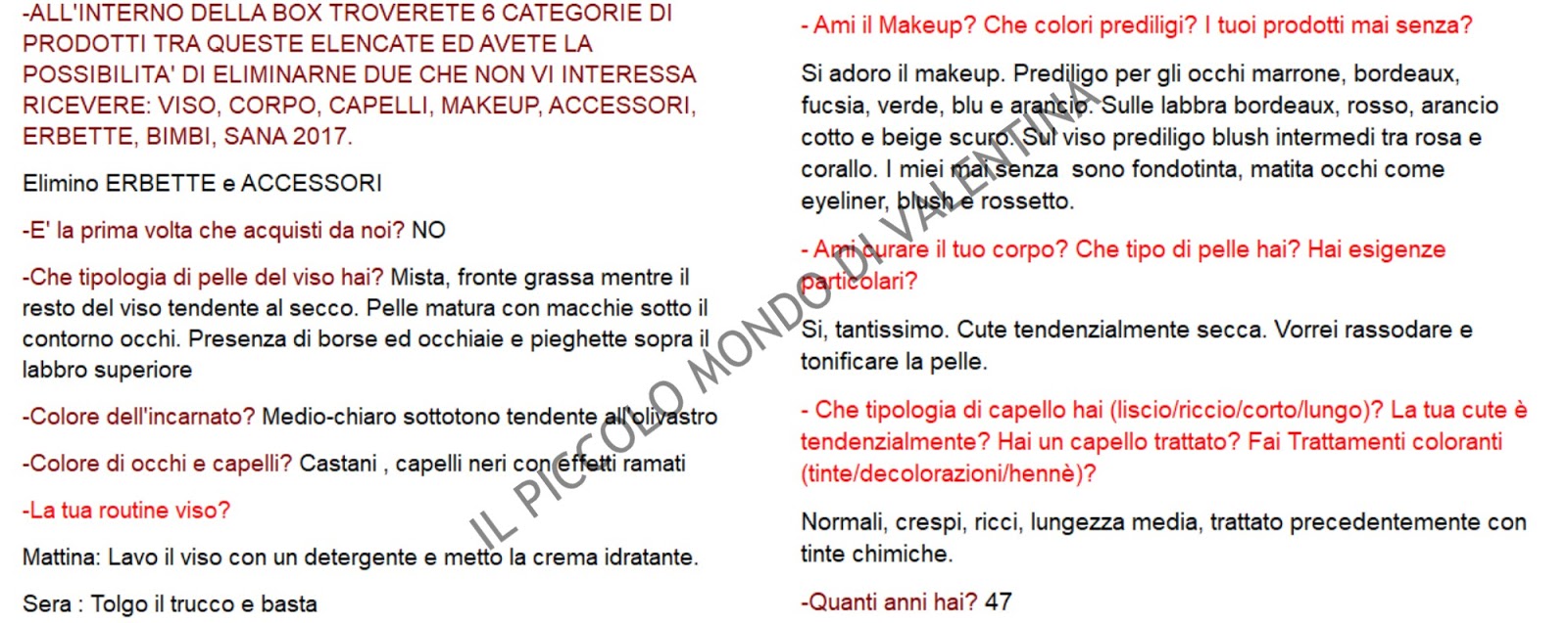 Inoltre ci tenevamo tanto a curare le box in ogni minimo dettaglio ed è per questo che abbiamo offerto un questionario curato in ogni sua parte per rispondere al meglio alle esigenze di ogni cliente. Ed è per questo che in primis abbiamo realizzato uno schema di prodotti che abbiamo in linea generale seguito per tutte ( es. 1° giorno : shampoo , 2° giorno : crema mani etc..) ma poi ci siamo basate sulle risposte dei vostri questionari e sulle vostre richieste, esigenze e preferenze.