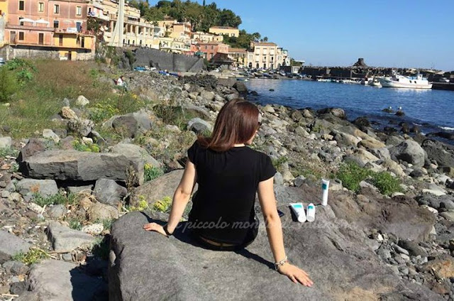 Ho deciso quindi di realizzare le foto a Santa Maria la Scala, un paesino davvero piccolissimo nelle zone del Catanese dove si mette in rilievo la bellezza della mia terra : il mare! E poiché reputo che questi prodotti siano davvero BELLI e per belli intendo belli a livello di formulazione perché sono fatti prima di tutto con passione ed amore quindi non potevo scegliere posto migliore!