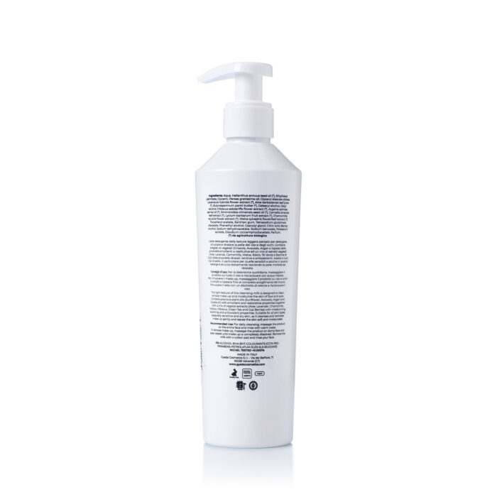 Latte detergente dalla texture leggera pensato per detergere, struccare e idratare la pelle del viso e degli occhi.
