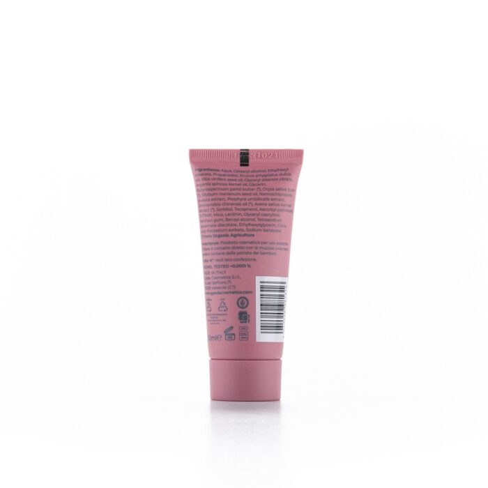 Aqua, Cetearyl alcohol, Ethylhexyl stearate, Propanediol, Prunus amygdalus dulcis oil, Vitis vinifera seed oil, Glyceryl stearate citrate, Argania spinosa kernel oil, Glycerin, Butyrospermum parkii butter (*), Oryza sativa bran (*), Silybum marianum seed oil, Nannochloropsis oculata extract, Porphyra umbilicalis extract, Simmondsia chinensis oil (*), Avena sativa kernel extract (*), Sorbitol, Tocopherol, Ascorbyl palmitate, CI 77491, Mica, Lecithin, Glyceryl caprylate, Xanthan gum, Benzyl alcohol, Tetrasodium glutamate diacetate, Ethylhexylglycerin, Citric acid, Potassium sorbate, Sodium benzoate.