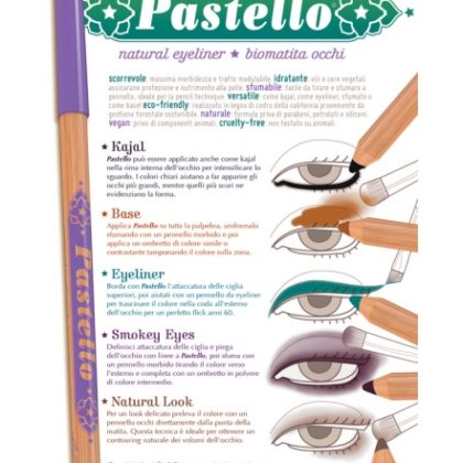 Pastello può essere applicato anche come kajal nella rima interna dell’occhio per intensificare lo sguardo. I colori chiari aiutano a far apparire gli occhi più grandi, mentre quelli più scuri ne evidenziano la forma.