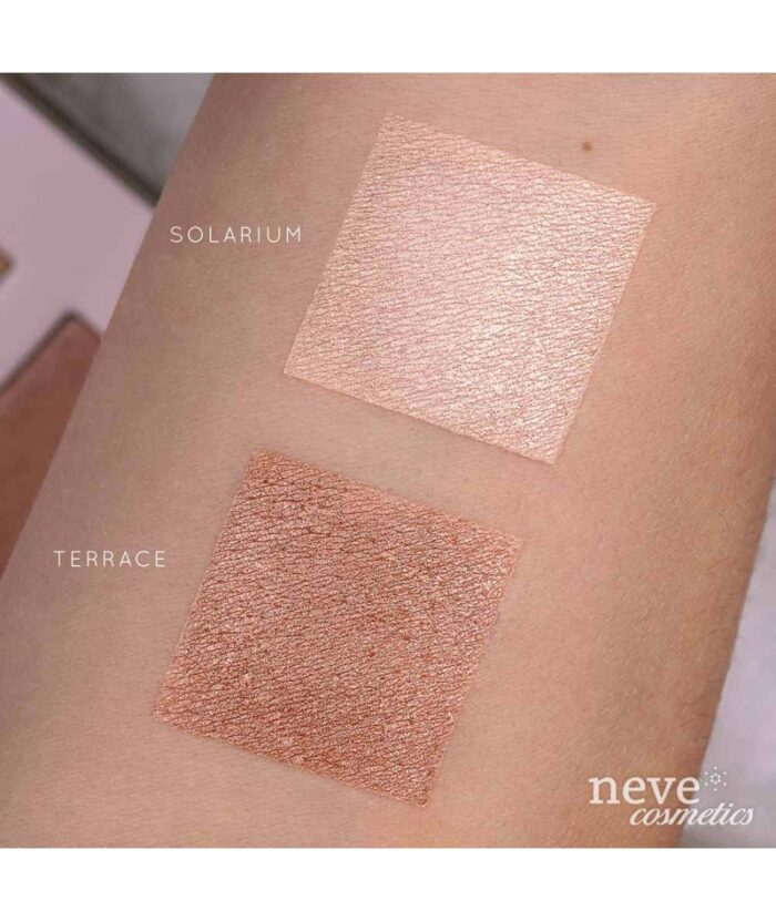 Solarium & Terrace Ingredients: Talc, Mica, Octyldodecyl Stearoyl Stearate, Magnesium Myristate, Caprylyl Glycol, Cetearyl Ethylhexanoate, Tin Oxide. (+/-) May Contain: CI 77891 (Titanium Dioxide), CI 77491 (Iron Oxides), CI 77492 (Iron Oxides), CI 77499 (Iron Oxides).