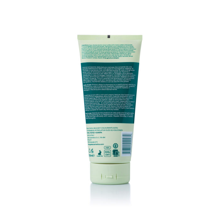 Uno scrub lavante dalla texture cremosa che consente sia una delicata esfoliazione della cute grazie ai microgranuli vegetali di nocciole e mandorle e sia una delicata pulizia di cute e lunghezze senza l’uso di tensioattivi schiumogeni.